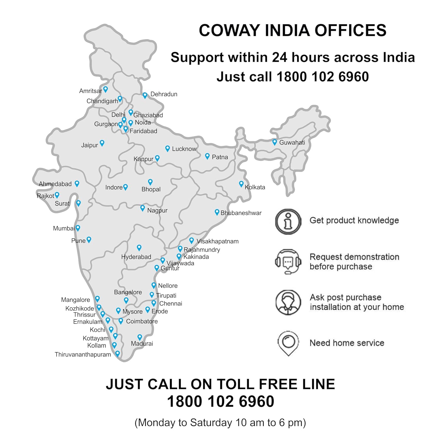 • DOOR STEP SERVICES: With over 90 dedicated offices across India, Coway provides door-step service for all users. We offer free installation and home service, ensuring customer needs are prioritized. Simply reach out via our toll-free number for assistance with demonstrations and any service requirements.